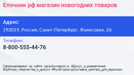 Елочник.рф, магазин новогодних товаров по адресу 192019, Россия, Санкт-Петербург, Фаянсовая, 26 в дальнейшем Организация, размещена в следующих категориях: