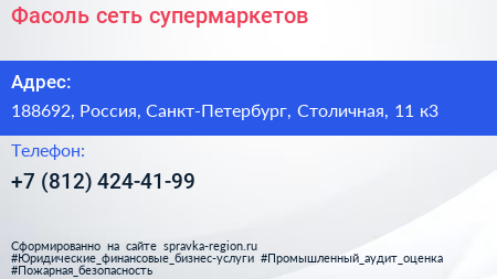 Фасоль, сеть супермаркетов по адресу 188692, Россия, Санкт-Петербург, Столичная, 11 к3 в дальнейшем Организация, размещена в следующих категориях: