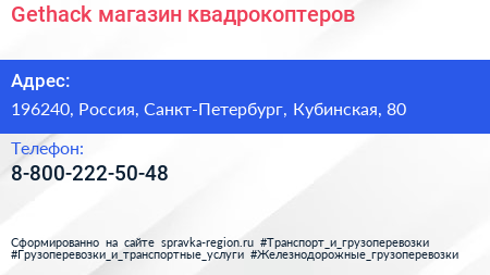 Gethack, магазин квадрокоптеров по адресу 196240, Россия, Санкт-Петербург, Кубинская, 80 в дальнейшем Организация, размещена в следующих категориях: