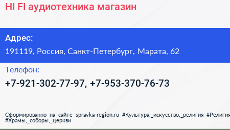 HI-FI аудиотехника, магазин по адресу 191119, Россия, Санкт-Петербург, Марата, 62 в дальнейшем Организация, размещена в следующих категориях: