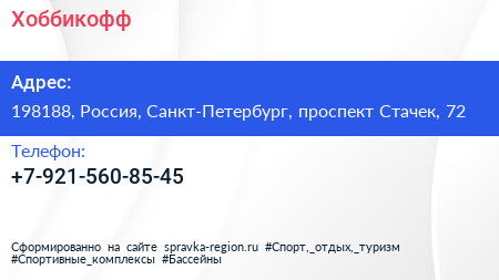 Хоббикофф по адресу 198188, Россия, Санкт-Петербург, проспект Стачек, 72 в дальнейшем Организация, размещена в следующих категориях: