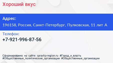 Хороший вкус по адресу 196158, Россия, Санкт-Петербург, Пулковская, 11 лит А в дальнейшем Организация, размещена в следующих категориях: