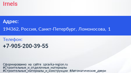 Irnels по адресу 194362, Россия, Санкт-Петербург, Ломоносова, 1 в дальнейшем Организация, размещена в следующих категориях: