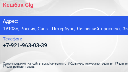 Кешбэк Clg по адресу 191036, Россия, Санкт-Петербург, Лиговский проспект, 35 в дальнейшем Организация, размещена в следующих категориях: