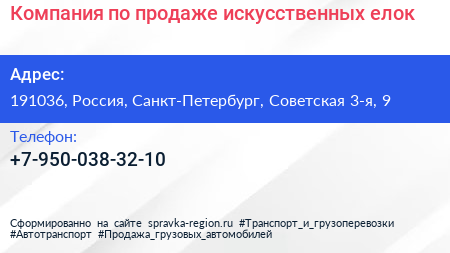 Компания по продаже искусственных елок по адресу 191036, Россия, Санкт-Петербург, Советская 3-я, 9 в дальнейшем Организация, размещена в следующих категориях: