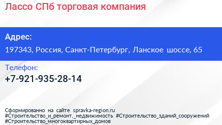 Лассо СПб, торговая компания по адресу 197343, Россия, Санкт-Петербург, Ланское шоссе, 65 в дальнейшем Организация, размещена в следующих категориях: