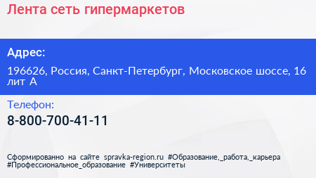 Лента, сеть гипермаркетов по адресу 196626, Россия, Санкт-Петербург, Московское шоссе, 16 лит А в дальнейшем Организация, размещена в следующих категориях: