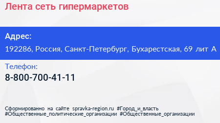 Лента, сеть гипермаркетов по адресу 192286, Россия, Санкт-Петербург, Бухарестская, 69 лит А в дальнейшем Организация, размещена в следующих категориях: