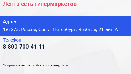 Лента, сеть гипермаркетов по адресу 197375, Россия, Санкт-Петербург, Вербная, 21 лит А в дальнейшем Организация, размещена в следующих категориях: