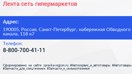 Лента, сеть гипермаркетов по адресу 190005, Россия, Санкт-Петербург, набережная Обводного канала, 118 к7 в дальнейшем Организация, размещена в следующих категориях: