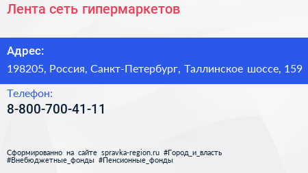 Лента, сеть гипермаркетов по адресу 198205, Россия, Санкт-Петербург, Таллинское шоссе, 159 в дальнейшем Организация, размещена в следующих категориях:
