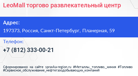 LeoMall, торгово-развлекательный центр по адресу 197373, Россия, Санкт-Петербург, Планерная, 59 в дальнейшем Организация, размещена в следующих категориях: