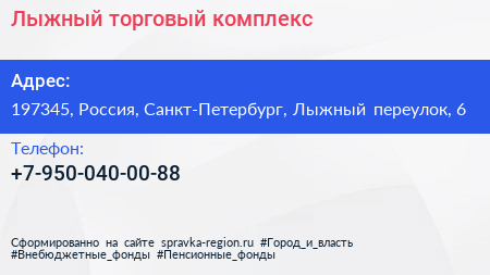 Лыжный, торговый комплекс по адресу 197345, Россия, Санкт-Петербург, Лыжный переулок, 6 в дальнейшем Организация, размещена в следующих категориях: