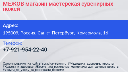 МЕЖОВ, магазин-мастерская сувенирных ножей по адресу 195009, Россия, Санкт-Петербург, Комсомола, 16 в дальнейшем Организация, размещена в следующих категориях: