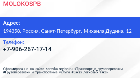MOLOKOSPB по адресу 194358, Россия, Санкт-Петербург, Михаила Дудина, 12 в дальнейшем Организация, размещена в следующих категориях: