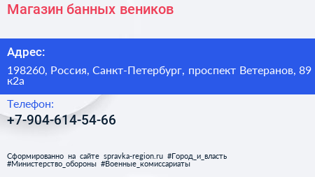 Магазин банных веников по адресу 198260, Россия, Санкт-Петербург, проспект Ветеранов, 89 к2а в дальнейшем Организация, размещена в следующих категориях: