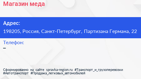 Магазин меда по адресу 198205, Россия, Санкт-Петербург, Партизана Германа, 22 в дальнейшем Организация, размещена в следующих категориях: