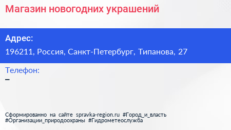 Магазин новогодних украшений по адресу 196211, Россия, Санкт-Петербург, Типанова, 27 в дальнейшем Организация, размещена в следующих категориях: