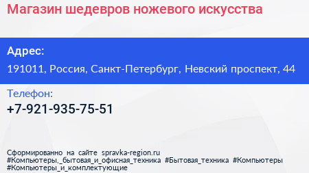 Магазин шедевров ножевого искусства по адресу 191011, Россия, Санкт-Петербург, Невский проспект, 44 в дальнейшем Организация, размещена в следующих категориях: