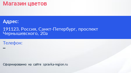 Магазин цветов по адресу 191123, Россия, Санкт-Петербург, проспект Чернышевского, 20а в дальнейшем Организация, размещена в следующих категориях: