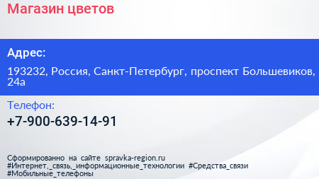 Магазин цветов по адресу 193232, Россия, Санкт-Петербург, проспект Большевиков, 24а в дальнейшем Организация, размещена в следующих категориях: