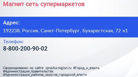 Магнит, сеть супермаркетов по адресу 192238, Россия, Санкт-Петербург, Бухарестская, 72 к1 в дальнейшем Организация, размещена в следующих категориях: