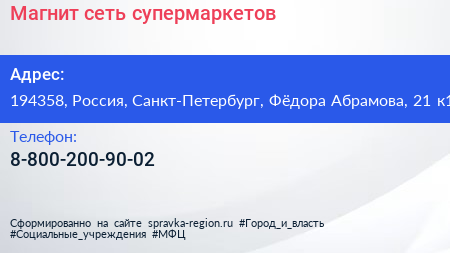 Магнит, сеть супермаркетов по адресу 194358, Россия, Санкт-Петербург, Фёдора Абрамова, 21 к1 в дальнейшем Организация, размещена в следующих категориях: