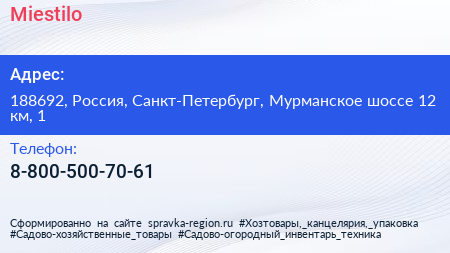 Miestilo по адресу 188692, Россия, Санкт-Петербург, Мурманское шоссе 12 км, 1 в дальнейшем Организация, размещена в следующих категориях: