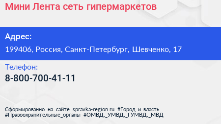Мини Лента, сеть гипермаркетов по адресу 199406, Россия, Санкт-Петербург, Шевченко, 17 в дальнейшем Организация, размещена в следующих категориях:
