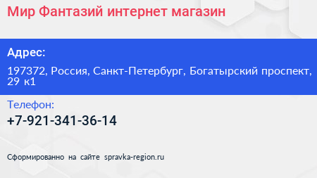 Мир Фантазий, интернет-магазин по адресу 197372, Россия, Санкт-Петербург, Богатырский проспект, 29 к1 в дальнейшем Организация, размещена в следующих категориях:
