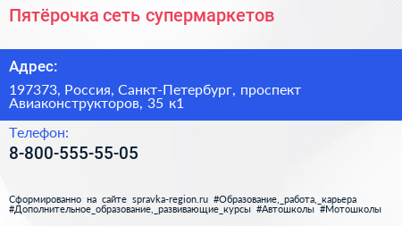 Пятёрочка, сеть супермаркетов по адресу 197373, Россия, Санкт-Петербург, проспект Авиаконструкторов, 35 к1 в дальнейшем Организация, размещена в следующих категориях: