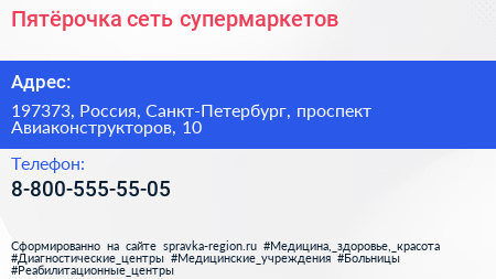 Пятёрочка, сеть супермаркетов по адресу 197373, Россия, Санкт-Петербург, проспект Авиаконструкторов, 10 в дальнейшем Организация, размещена в следующих категориях:
