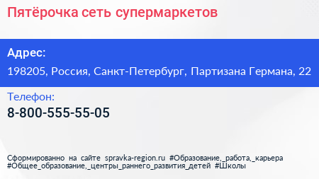 Пятёрочка, сеть супермаркетов по адресу 198205, Россия, Санкт-Петербург, Партизана Германа, 22 в дальнейшем Организация, размещена в следующих категориях: