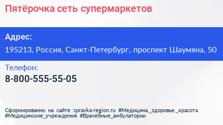 Пятёрочка, сеть супермаркетов по адресу 195213, Россия, Санкт-Петербург, проспект Шаумяна, 50 в дальнейшем Организация, размещена в следующих категориях: