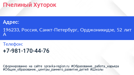 Пчелиный Хуторок по адресу 196233, Россия, Санкт-Петербург, Орджоникидзе, 52 лит А в дальнейшем Организация, размещена в следующих категориях: