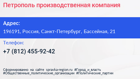 Петрополь, производственная компания по адресу 196191, Россия, Санкт-Петербург, Бассейная, 21 в дальнейшем Организация, размещена в следующих категориях: