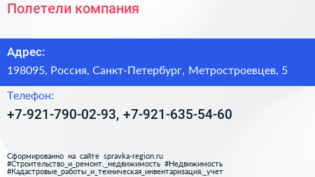 Полетели, компания по адресу 198095, Россия, Санкт-Петербург, Метростроевцев, 5 в дальнейшем Организация, размещена в следующих категориях: