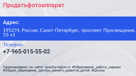 Продатьфотоаппарат по адресу 195274, Россия, Санкт-Петербург, проспект Просвещения, 53 к1 в дальнейшем Организация, размещена в следующих категориях: