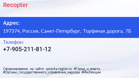 Recopter по адресу 197374, Россия, Санкт-Петербург, Торфяная дорога, 7Б в дальнейшем Организация, размещена в следующих категориях: