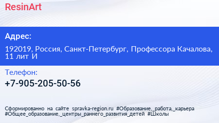 ResinArt по адресу 192019, Россия, Санкт-Петербург, Профессора Качалова, 11 лит И в дальнейшем Организация, размещена в следующих категориях: