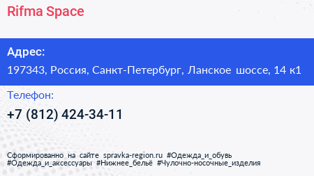Rifma Space по адресу 197343, Россия, Санкт-Петербург, Ланское шоссе, 14 к1 в дальнейшем Организация, размещена в следующих категориях: