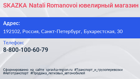 SKAZKA Natali Romanovoi, ювелирный магазин по адресу 192102, Россия, Санкт-Петербург, Бухарестская, 30 в дальнейшем Организация, размещена в следующих категориях: