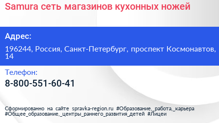 Samura, сеть магазинов кухонных ножей по адресу 196244, Россия, Санкт-Петербург, проспект Космонавтов, 14 в дальнейшем Организация, размещена в следующих категориях: