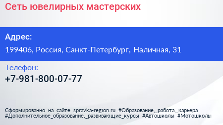 Сеть ювелирных мастерских по адресу 199406, Россия, Санкт-Петербург, Наличная, 31 в дальнейшем Организация, размещена в следующих категориях: