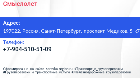 Смыслолет по адресу 197022, Россия, Санкт-Петербург, проспект Медиков, 5 к7 в дальнейшем Организация, размещена в следующих категориях: