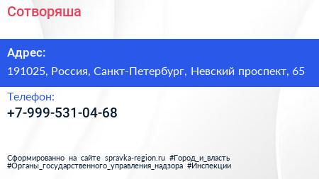 Сотворяша по адресу 191025, Россия, Санкт-Петербург, Невский проспект, 65 в дальнейшем Организация, размещена в следующих категориях:
