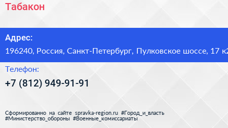 Табакон по адресу 196240, Россия, Санкт-Петербург, Пулковское шоссе, 17 к2 в дальнейшем Организация, размещена в следующих категориях:
