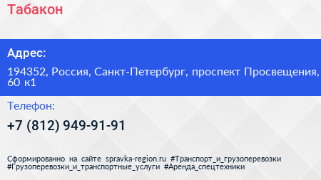 Табакон по адресу 194352, Россия, Санкт-Петербург, проспект Просвещения, 60 к1 в дальнейшем Организация, размещена в следующих категориях:
