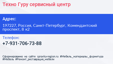 Техно Гуру, сервисный центр по адресу 197227, Россия, Санкт-Петербург, Комендантский проспект, 8 к2 в дальнейшем Организация, размещена в следующих категориях: