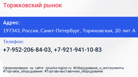 Торжковский, рынок по адресу 197343, Россия, Санкт-Петербург, Торжковская, 20 лит А в дальнейшем Организация, размещена в следующих категориях: